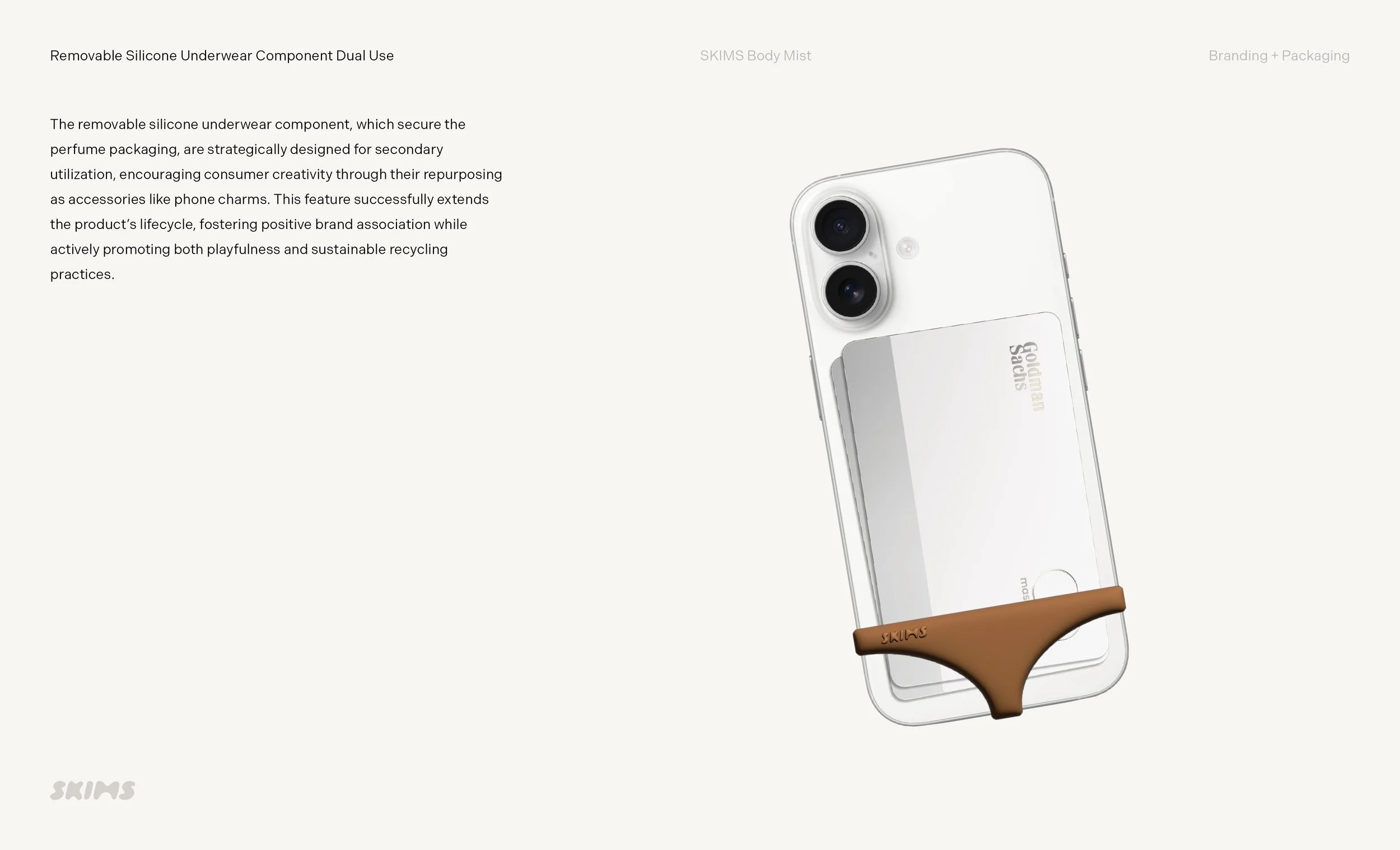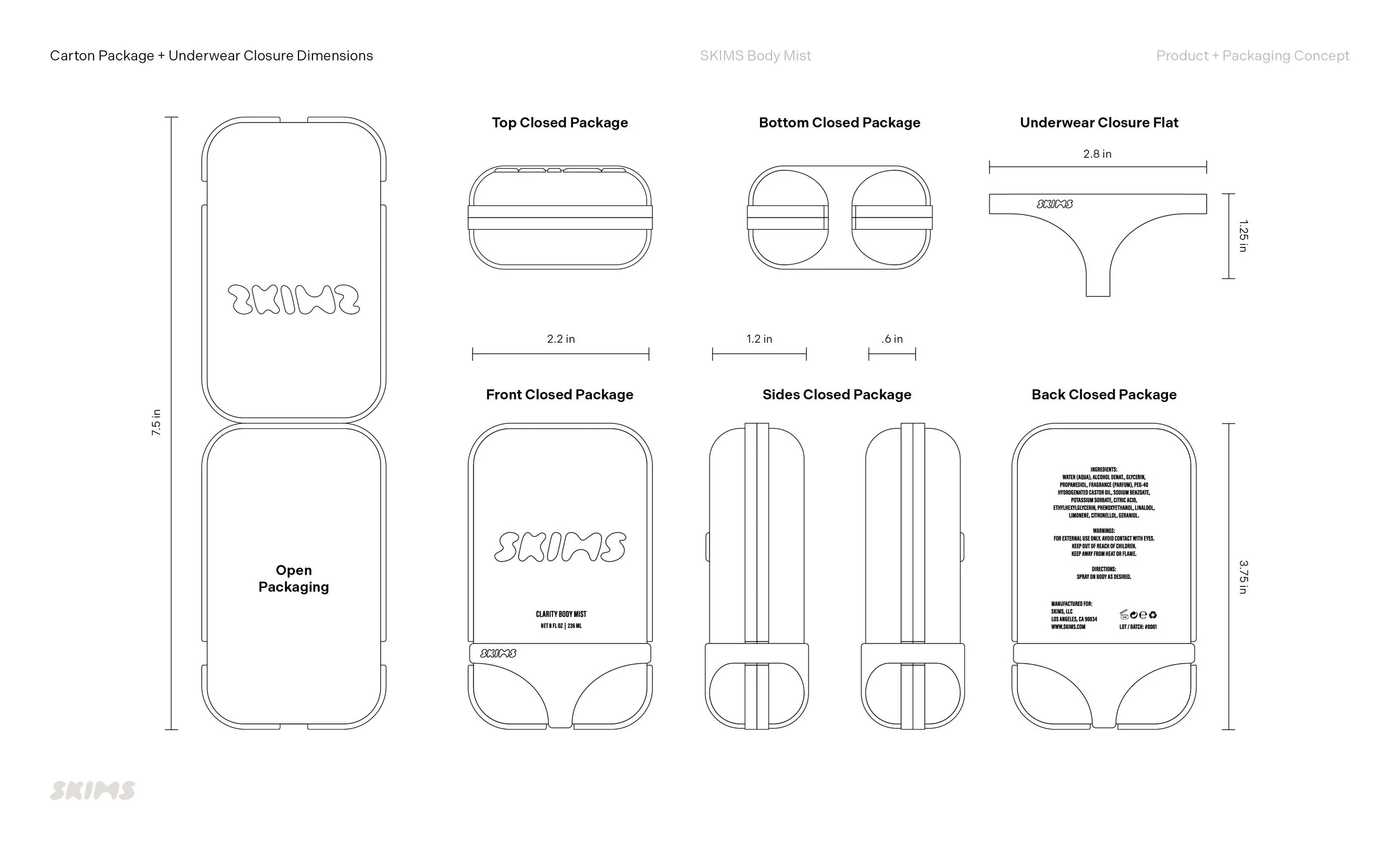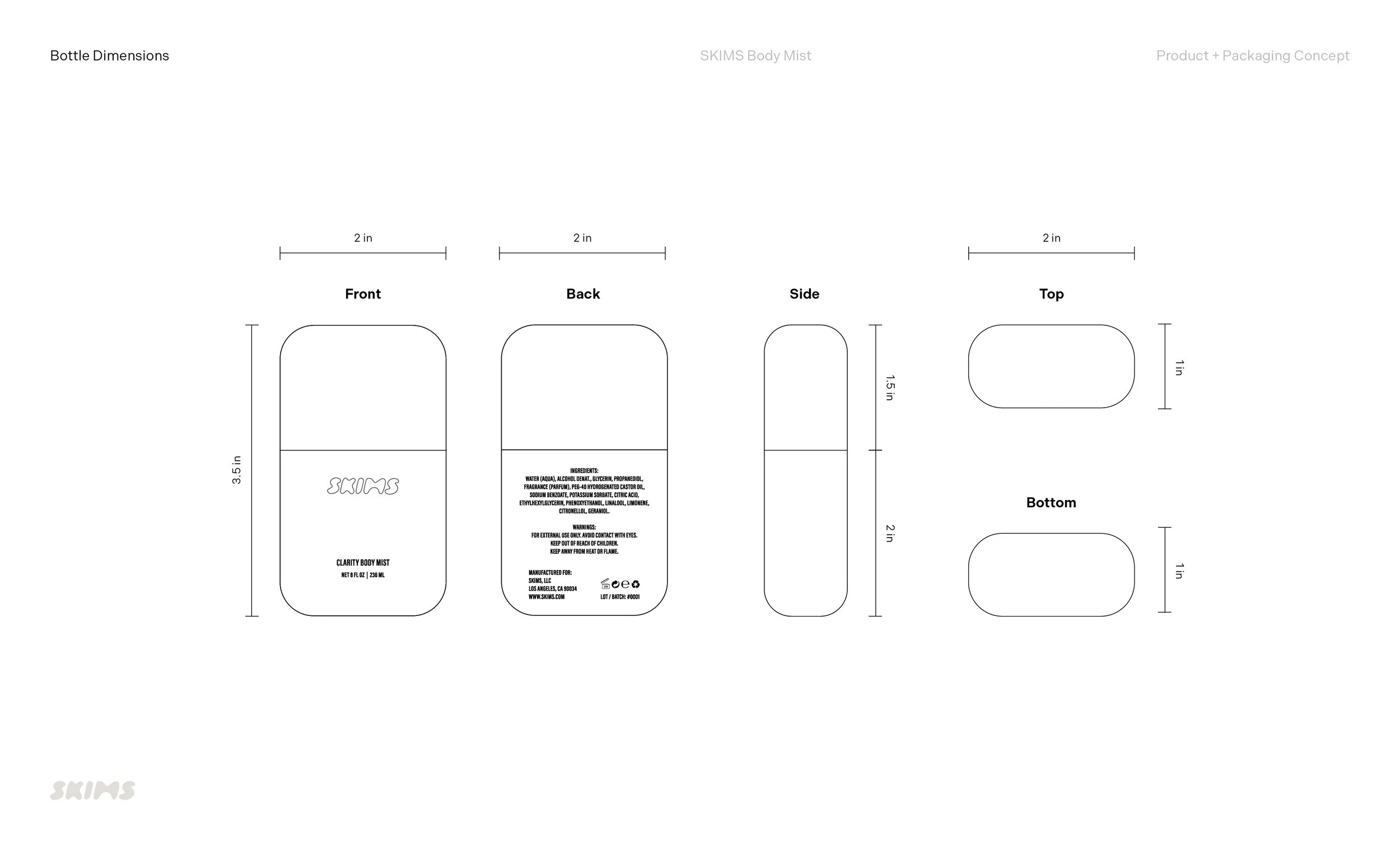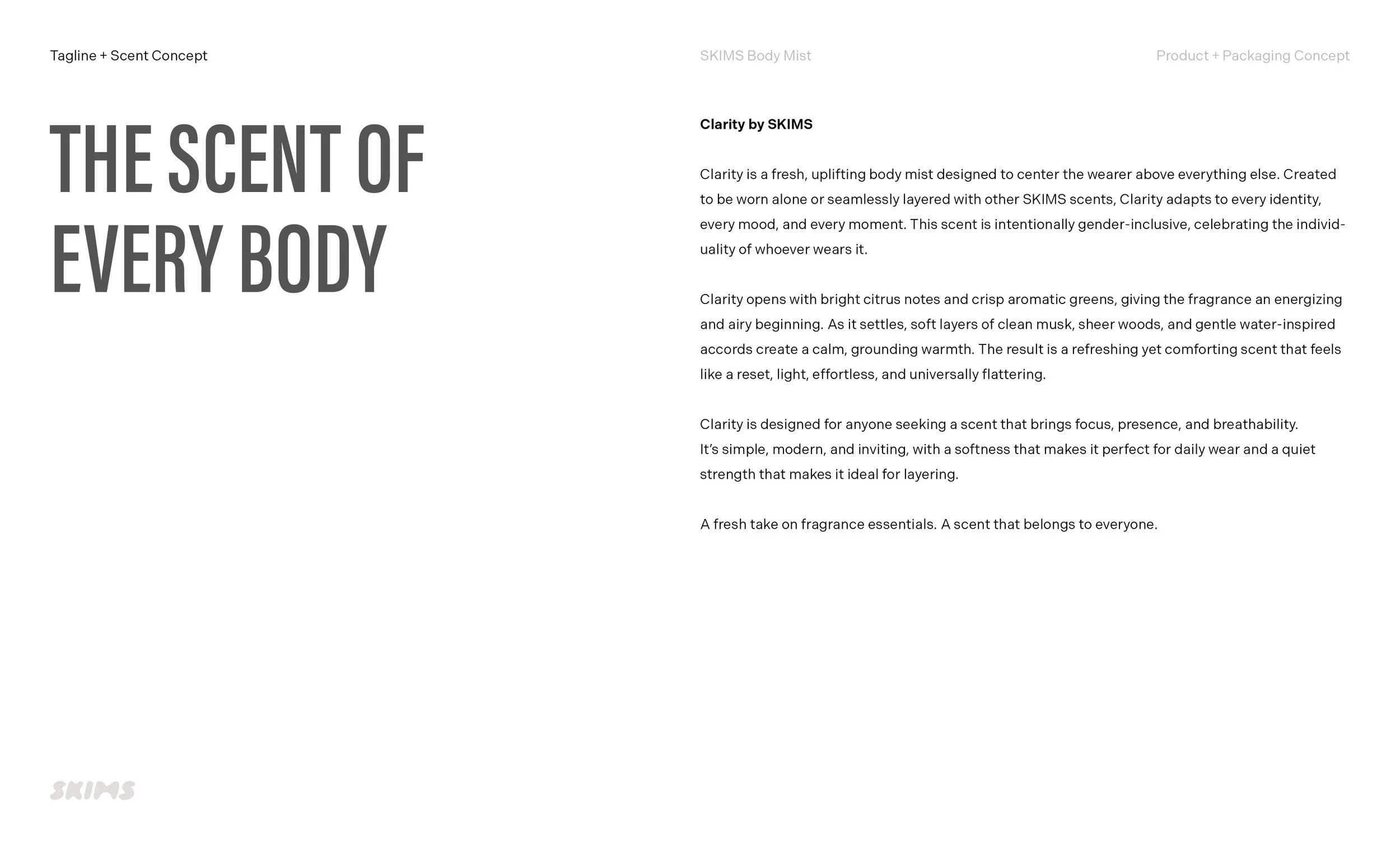Clarity is a conceptual SKIMS body mist created to expand the brand’s growing fragrance category. Designed as a gender-inclusive, fresh, and uplifting scent, Clarity celebrates individuality and encourages wearers to express themselves through scent, whether worn alone or layered. This project explores the full packaging and visual identity for the fragrance, including bottle design, carton structure, materials, and graphic system. The goal was to capture SKIMS’ signature minimal aesthetic while introducing a sensory, modern design language that reflects the brightness and calm of the scent itself.